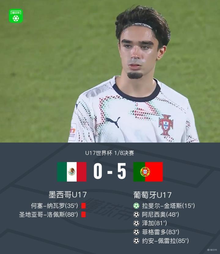 葡萄牙U17 5-0九人墨西哥U17晋级8强,泽加传射,阿尼西奥破门