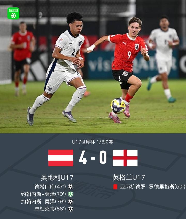 U17世界杯:奥地利4-0十人英格兰晋级8强,莫泽双响