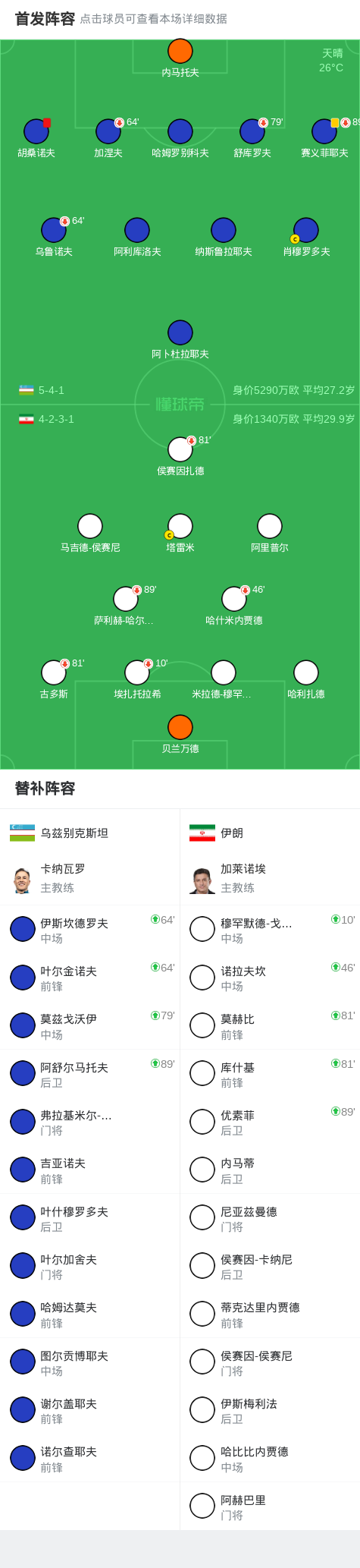 点球大战乌兹别克斯坦4-3伊朗,肖穆罗多夫点球罚进,米拉德-穆罕默迪失点战报bot @懂球帝2025-11-19 01:50北京时间11月19日国际友谊赛,乌兹别克斯坦对阵伊朗。最终比分乌兹别克斯坦 4-3 伊朗。点击查看本场比赛详细数据>>精彩瞬间第69分钟,乌兹别克斯坦球队胡桑诺夫吃到红牌。 球队阵容 技术统计 展开更多