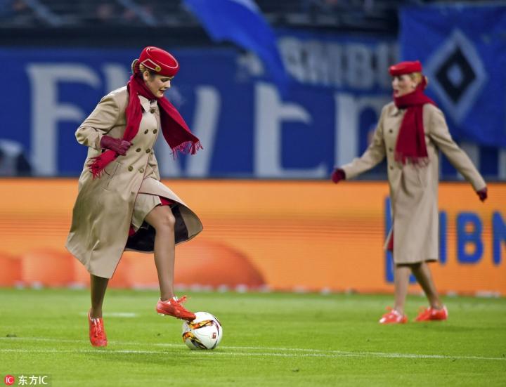2016年1月23日,德国汉堡,球队赞助商、阿联酋航空公司的空姐大秀球技