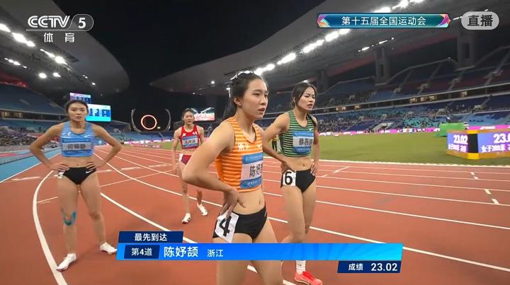 11月19日,全运会女子200米决赛,浙江队16岁的陈妤颉23秒02再夺一金!湖北队朱俊颖获得亚军,江苏队蔡燕婷获得铜牌,四川队的刘英兰途中摔倒。