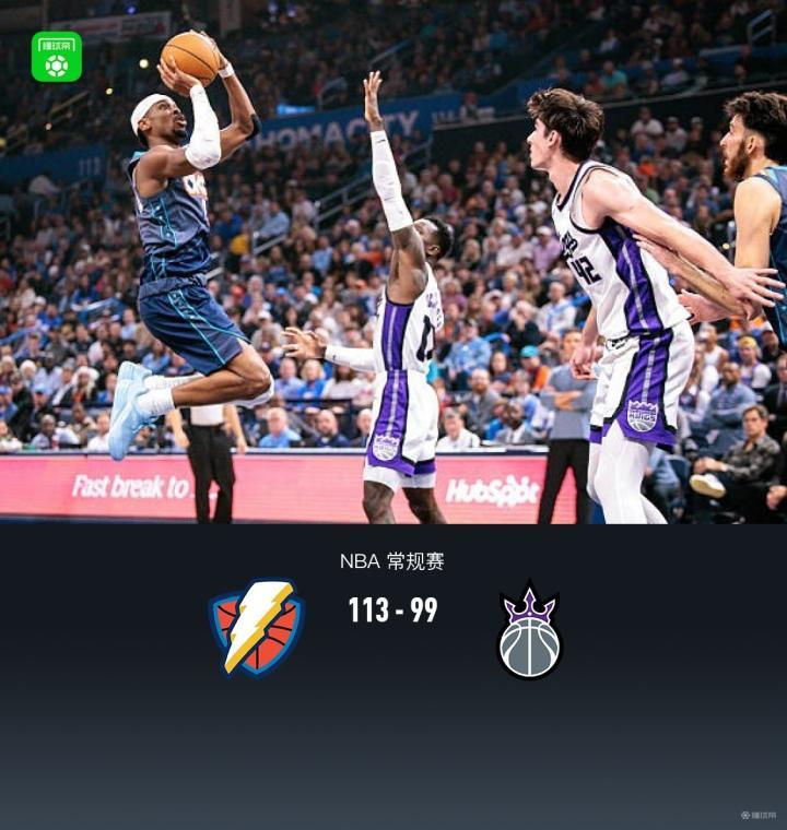 第四节雷霆多尔特拿下11分,国王蒙克拿下10分,最终雷霆113-99战胜国王