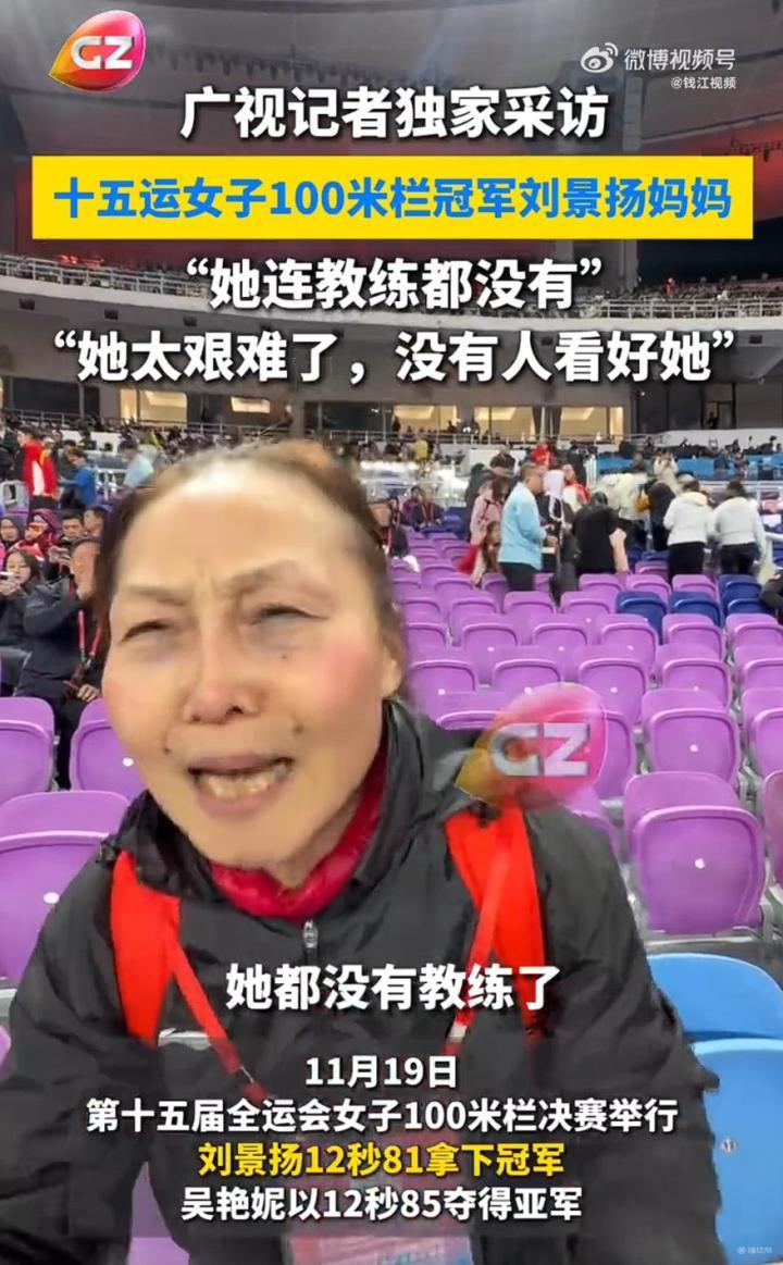 11月19日,全运会女子100米栏:刘景扬12秒81获得金牌,吴艳妮12秒85第二。赛后,刘景扬社媒回应此前母亲称她没有教练一事写道:我一直跟着三级跳组训练,教练也是兼职带我跨栏。