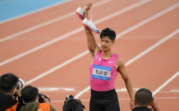 11月20日,全运会男子4X100米决赛,36岁的亚洲飞人苏炳添迎来谢幕战。赛后,他举起战靴,示意退役。