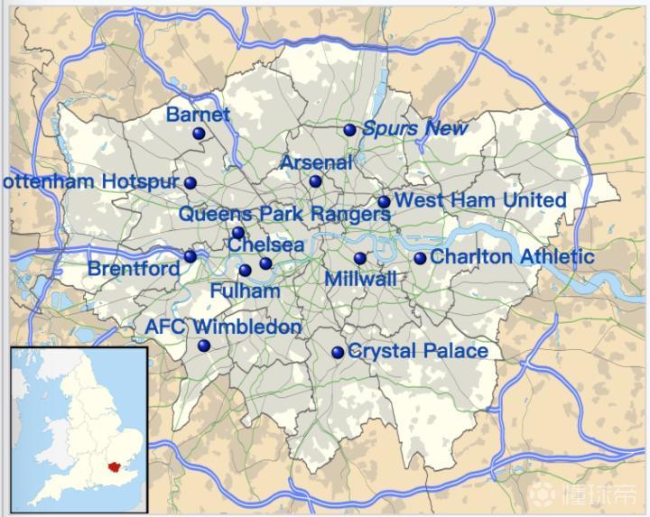 2017/18赛季中,球队主场坐落于伦敦及伦敦周边的英超球会共有5家:阿森纳,切尔西,托特纳姆热刺,西汉姆联以及水晶宫。