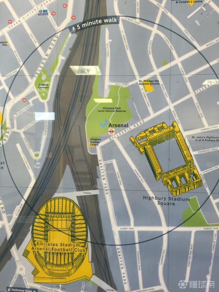在阿森纳地铁站内导览图中,我们可以看到,海布里球场旧址位于地铁站东南部,酋长球场位于球场西南部。均位于阿森纳站步行5分钟的路程内。乘坐地铁观战,确实是伦敦市民便利的选择。