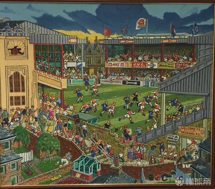 在包厢内我们可以看到关于海布里球场的漫画。工人阶级带着贝雷帽,穿着衬衫马甲来观看比赛。看台上有雪铁龙,耐克的广告。入口处有卖百事可乐的小店。旧日的主场比赛充满生活气息。
