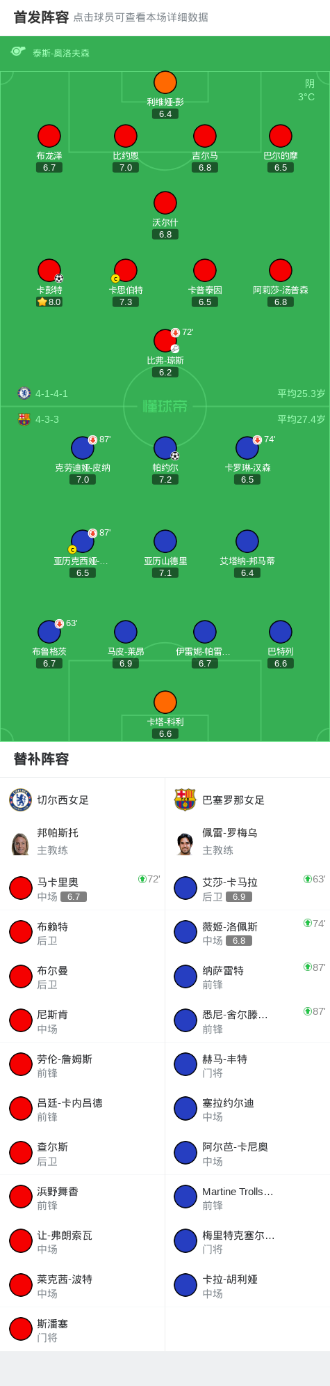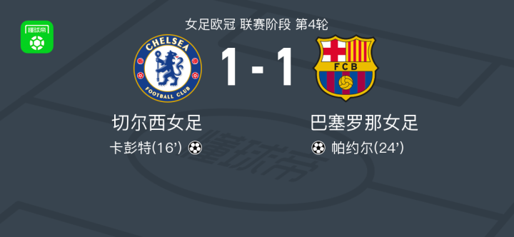 切尔西女足1-1巴塞罗那女足,卡彭特破门,帕约尔扳平比分