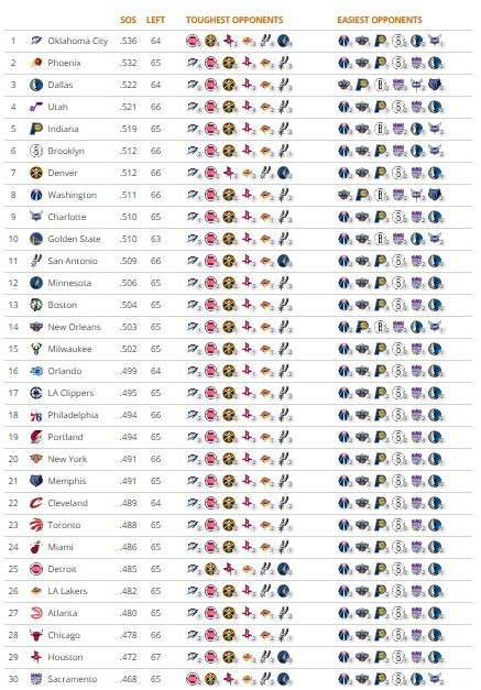NBA各队剩余赛程难度:雷霆第一,勇士第10,湖人第26,火箭第29