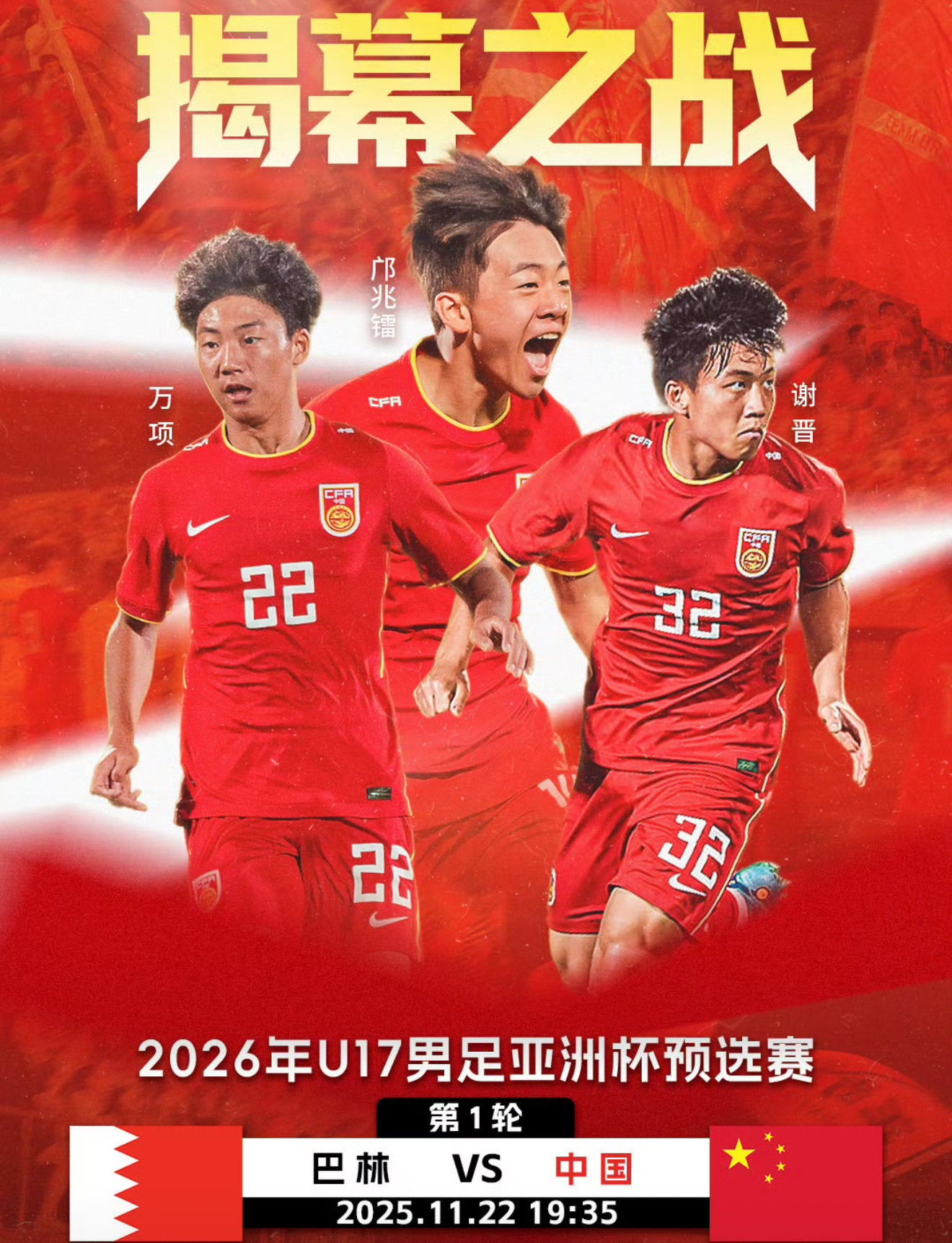U17亚洲杯中国队名单出炉 五名留洋球员全部入选 门将:1-秦子牛、12-陈城云、23-曹钰 后卫:2-金峰、4-南子勋、5-李钧鹏、6-金昱成、8-张旭尧、13-李铭杰、14-张君豪、22-程晟涵 中场:3-谢晋、7-周雨诺、10-邝兆镭、11-何思凡、15-孔玺诺、16-陈炳汐、17-王贺毅、18-徐正鹏、19-万项 前锋:9-张伯霖、20-赵松源、21-帅惟浩