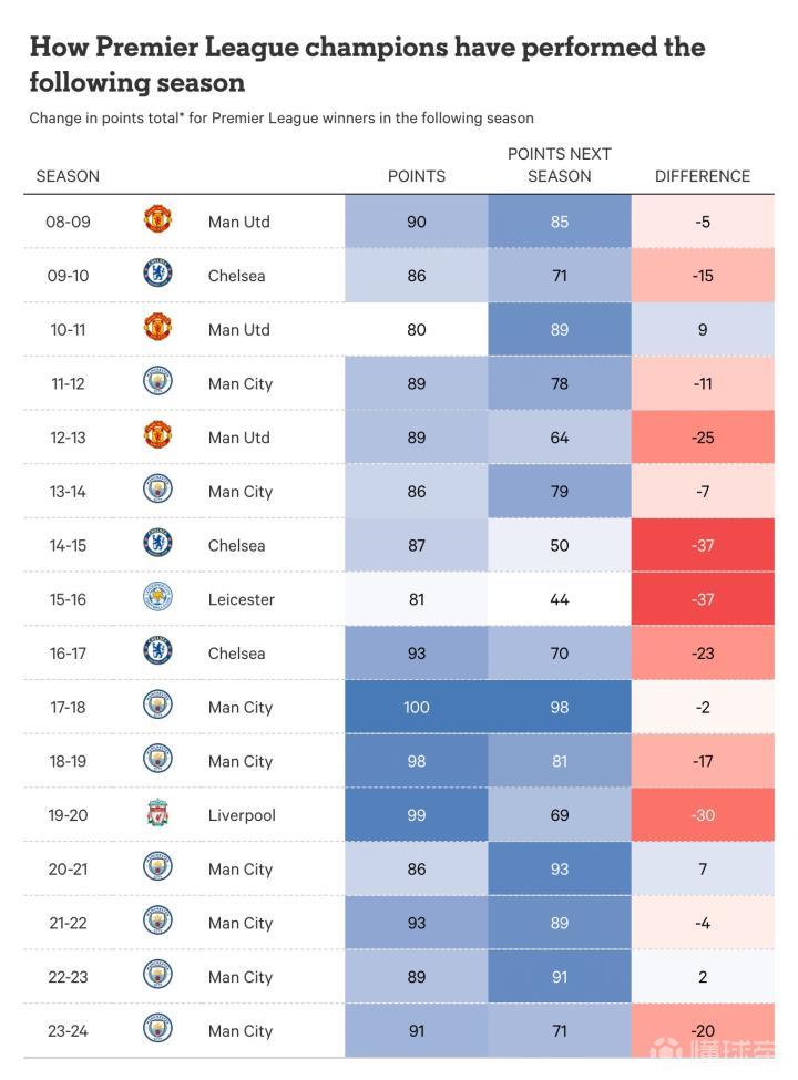 过去15个赛季里,自2010-11赛季安切洛蒂执教的切尔西开始,卫冕冠军球队的积分较上一赛季下滑至少10分的情况出现了9次。