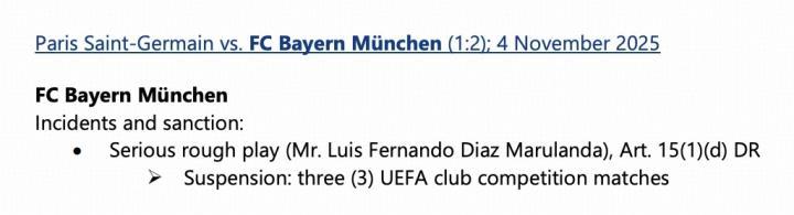 根据《图片报》记者法尔克、尼科-林纳和海科-尼德德勒的最新报道,路易斯-迪亚斯将因为对阵巴黎时染红被禁赛三场,拜仁将对此判罚进行上诉。