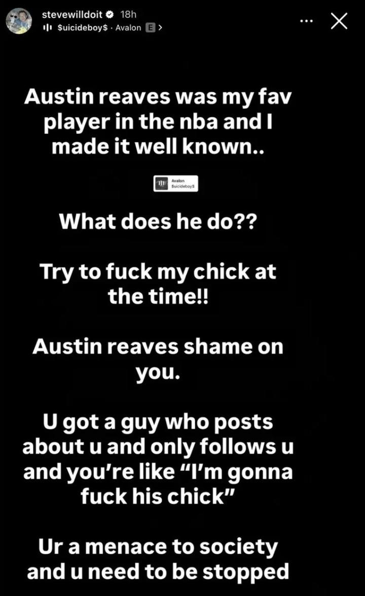 SteveWillDoIt发文:奥斯汀-里夫斯曾是我最喜欢的NBA球员,这点我之前也毫不掩饰地公开表达过……但他做了什么??他居然想和我当时的女友合卺之欢!!奥斯汀-里夫斯,你真该感到羞耻。