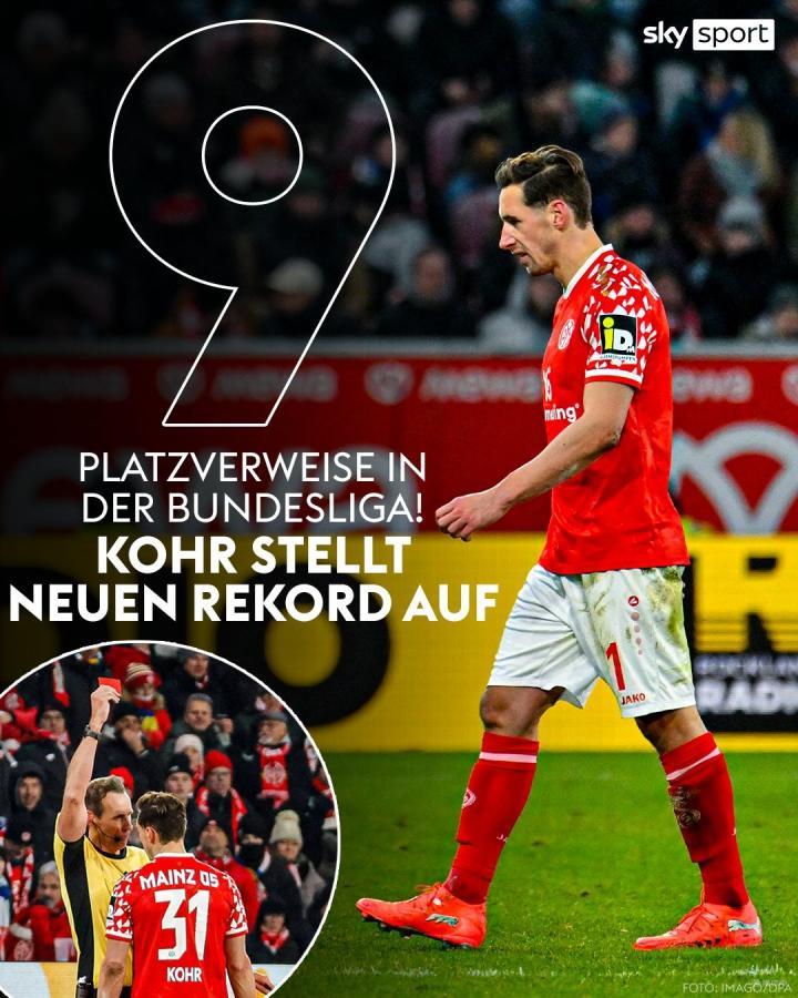 美因茨后卫科尔德甲生涯第9次染红,成德甲历史染红最多球员