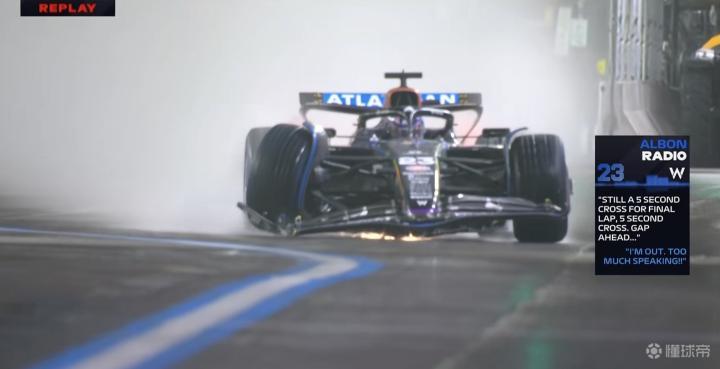 阿尔本在16号弯复刻去年科拉平托的事故,赛车的前翼严重受损,他也将赛车慢慢开入维修区!