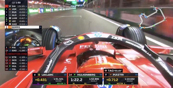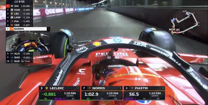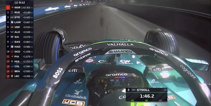 Q3第二轮飞驰圈结束,两台迈凯伦排在第一&第三,塞恩斯上到第2;