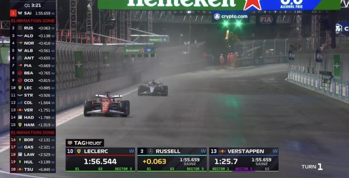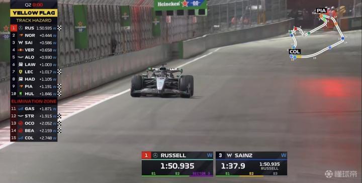 雨势逐渐减小,Q2首轮飞驰圈结束,诺里斯暂居榜首,拉塞尔、斯特罗尔排在二三;