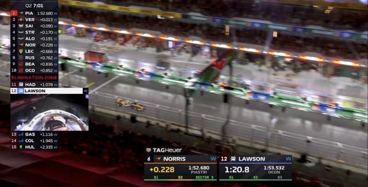 赛道状况不断演进,第二轮飞驰圈后皮亚斯特里来到榜首,诺里斯排在第6;