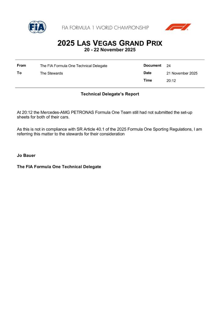 官方:梅赛德斯的两台赛车在排位赛开始后12分钟依然没有向FIA提交设定参数,此事已经提交给赛会仲裁,因此梅赛德斯双车存在双车DSQ的情况!