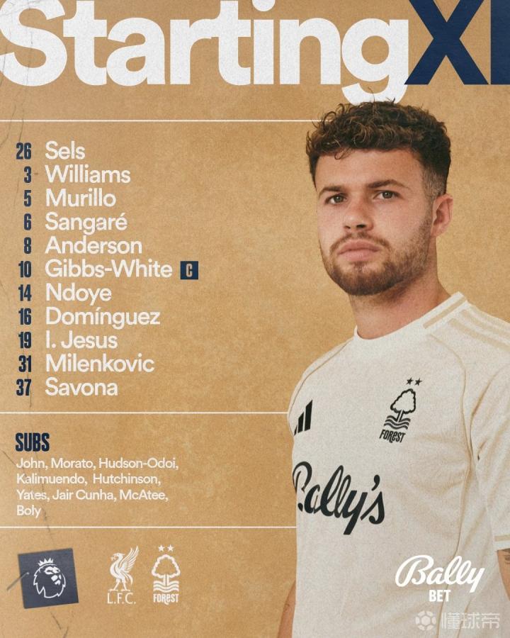 诺丁汉森林首发:26-泽尔斯、3-内科-威廉斯、5-穆里略、31-米伦科维奇、37-萨沃纳、16-多明格斯、8-埃利奥特-安德森、10-吉布斯-怀特、6-桑加雷、14-恩多耶、19-伊戈尔-热苏斯