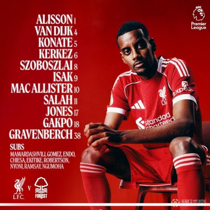 利物浦vs森林:萨拉赫、伊萨克、加克波首发,阿利松复出