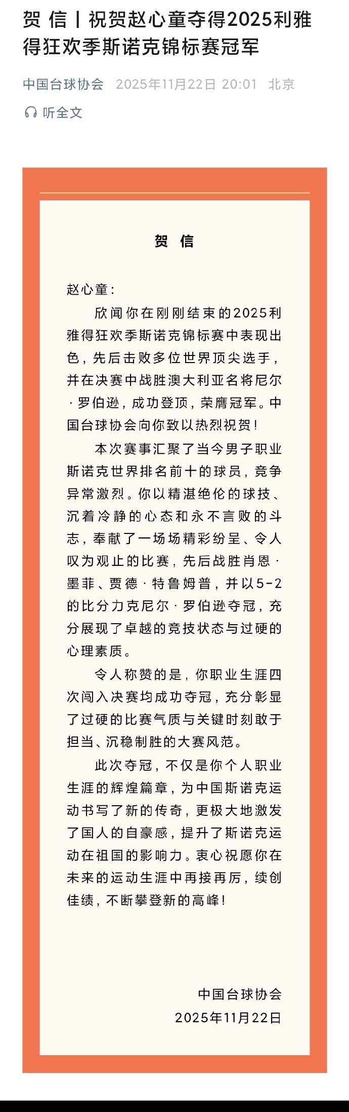 11月22日,赵心童连胜特鲁姆普、罗伯逊,夺得利雅得狂欢季斯诺克锦标赛冠军。随后,中国台球协会发表贺信。