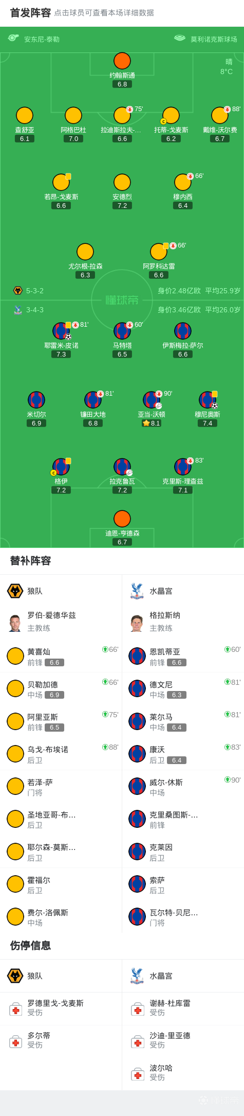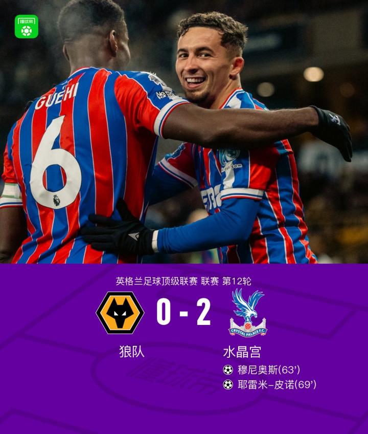 水晶宫2-0客胜狼队,皮诺轰世界波,穆尼奥斯建功