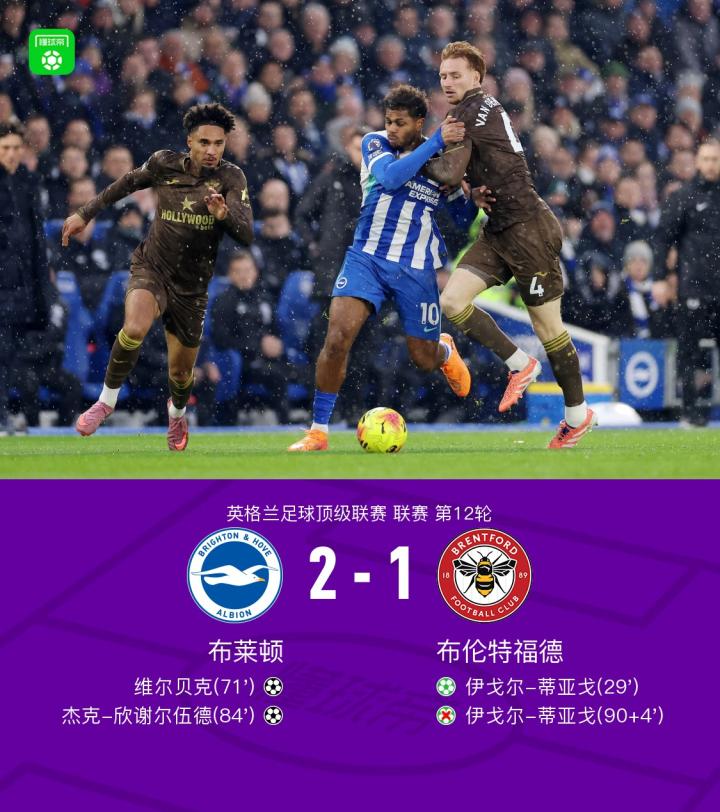北京时间11月22日23:00,英超第12轮,布莱顿坐镇主场迎战布伦特福德。上半场,伊戈尔-蒂亚戈主罚点球命中,为球队取得领先。下半场,维尔贝克扳平比分,随后杰克-欣谢尔伍德攻入反超球,补时蒂亚戈点球被费布鲁亨扑出。最终,布莱顿2-1逆转战胜布伦特福德。