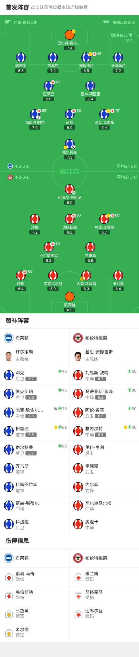 布莱顿2-1布伦特福德,欣谢尔伍德制胜,蒂亚戈点球二中一