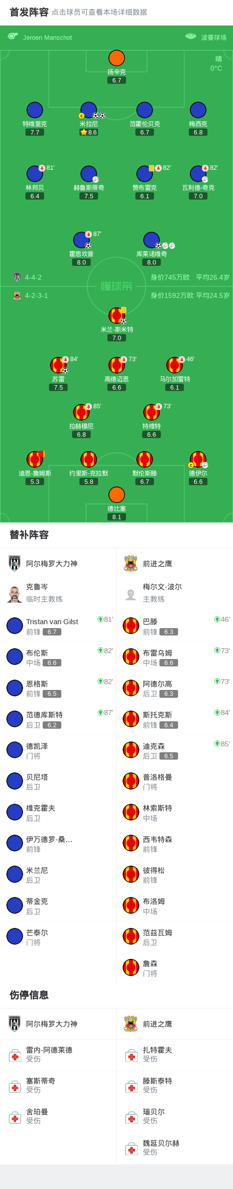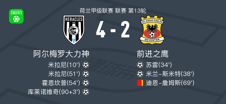 北京时间11月23日荷兰甲级联赛 联赛 第13轮,阿尔梅罗大力神主场对阵前进之鹰。阿尔梅罗大力神米拉尼梅开二度,霍恩坎普破门,库莱诺维奇破门。前进之鹰苏雷破门,米兰-斯米特破门。最终比分阿尔梅罗大力神 4-2 前进之鹰。