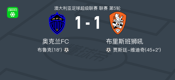 北京时间11月23日,澳大利亚足球超级联赛第5轮展开较量,奥克兰FC坐镇主场迎战布里斯班狮吼。比赛中,奥克兰FC率先打破僵局,球员布鲁克成功破门,为主队取得领先。上半场临近结束前,布里斯班狮吼由鲁斯送出助攻,贾斯廷-维迪奇建功,将比分扳平。此后双方均未能再度改写比分,最终全场战罢,奥克兰FC与布里斯班狮吼以1比1握手言和。