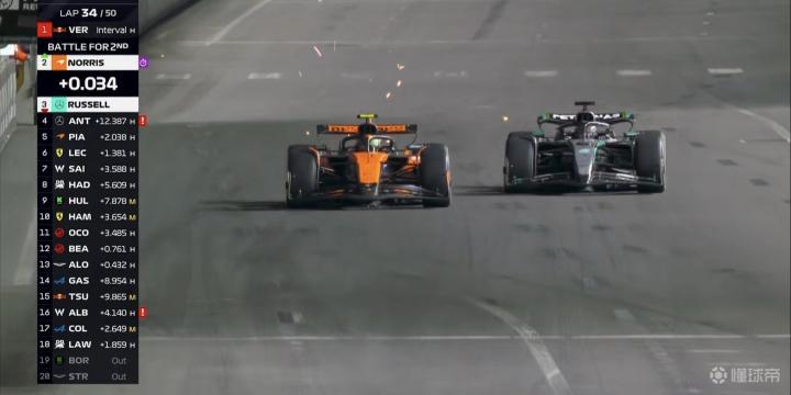 第34圈:诺里斯在14号弯前超越拉塞尔,他将开始利用干净空气全力追近维斯塔潘!