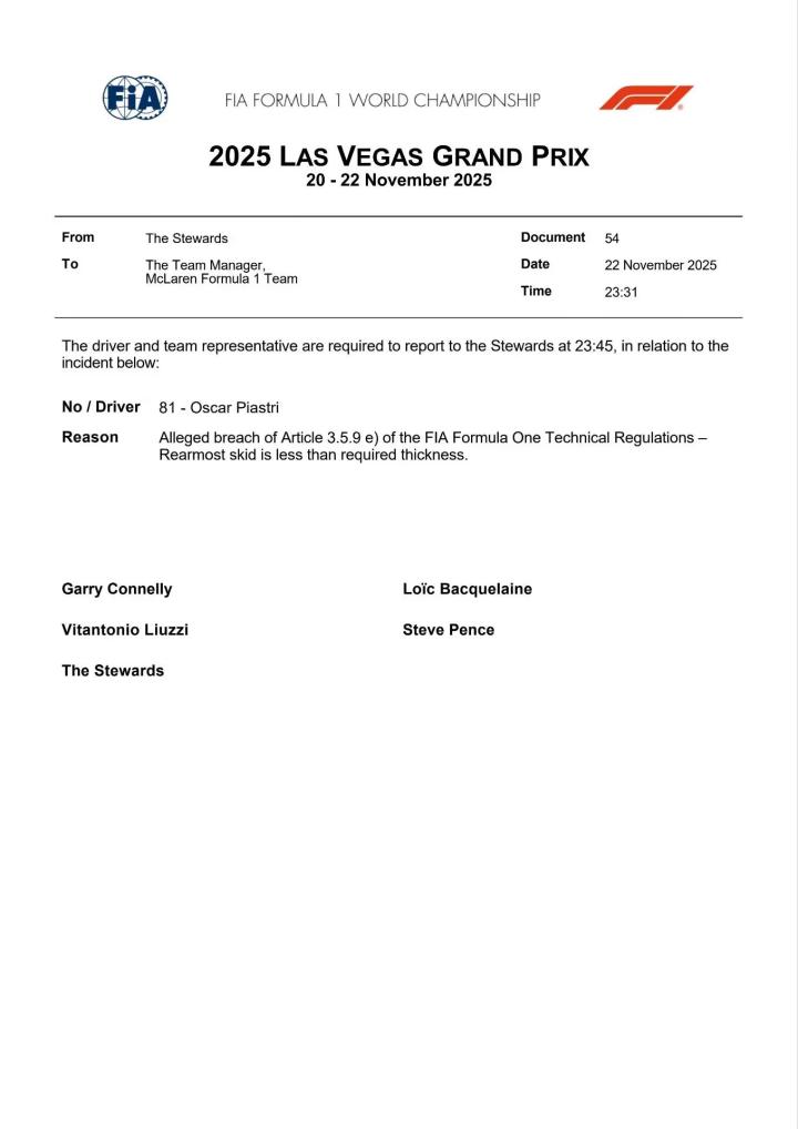 北京时间11月23日,在F1拉斯维加斯的赛后,FIA官方公布技术文件,皮亚斯特里和诺里斯的底板剩余均小于规定的9mm,已被上报赛会仲裁,将面临双车DSQ的风险。