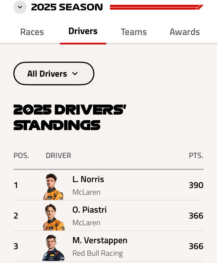 迈凯伦双车被DSQ后,维斯塔潘与诺里斯分差缩小至24分David_Ro @懂球帝2025-11-23 17:52北京时间11月23日,在F1拉斯维加斯大奖赛赛后,迈凯伦双车因底板磨损过度被官方取消成绩。最新积分榜上,维斯塔潘积分已经追平皮亚斯特里,落后榜首诺里斯24分。这样一来,诺里斯的优势从42分直接大幅减少至24分,在还剩最后两站并附加一个冲刺赛的情况下,2025赛季F1车手总冠军的悬念再起。展开更多