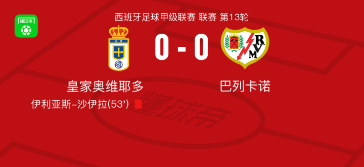 皇家奥维耶多0-0巴列卡诺,平分秋色战报bot @懂球帝2025-11-23 23:02北京时间11月23日西班牙足球甲级联赛 联赛 第13轮,皇家奥维耶多主场对阵巴列卡诺。最终比分皇家奥维耶多 0-0 巴列卡诺。点击查看本场比赛详细数据>>点击查看西甲完整积分榜>>精彩瞬间第53分钟,皇家奥维耶多球队伊利亚斯-沙伊拉吃到红牌。 球队阵容 技术统计 展开更多