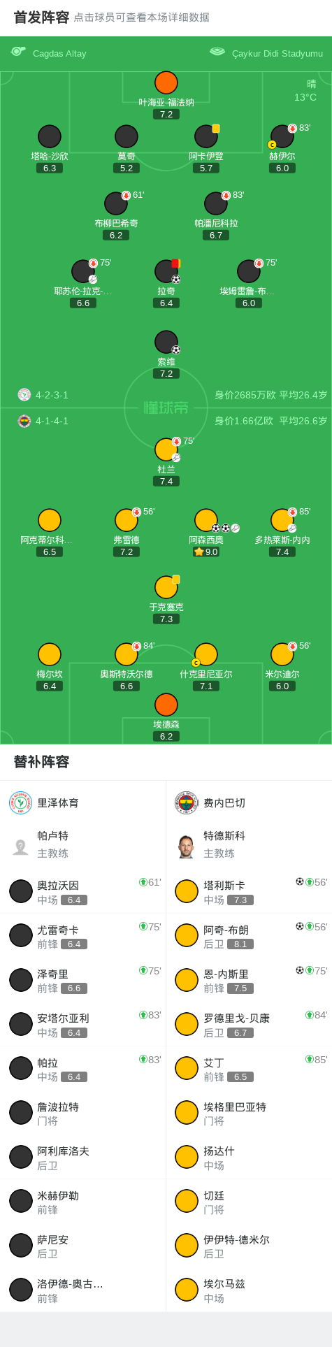 北京时间11月24日土耳其足球超级联赛 联赛 第13轮,里泽体育主场对阵费内巴切。里泽体育索维破门,拉奇破门。费内巴切阿森西奥梅开二度,塔利斯卡破门,恩-内斯里破门,阿奇-布朗破门。最终比分里泽体育 2-5 费内巴切。