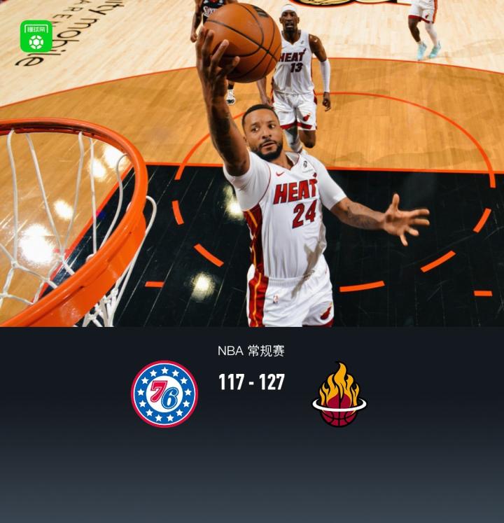 第四节76人沃特福德拿下5分,热火哈克斯拿下8分,最终76人117-127不敌热火