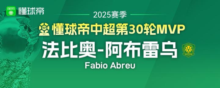 懂球帝2025赛季中超第30轮MVP:法比奥-阿布雷乌