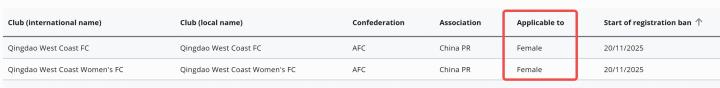 但在两条转会禁令的适用性备注上,该网站又都注明了只适用于“女子”(Female)。目前尚不清楚为何国际足联要把女子的转会禁令分别加在青岛西海岸的男、女足两支球队身上。
