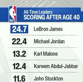 比赛期间,转播方给出了一组关于詹姆斯的数据:在40岁之后,詹姆斯场均能拿到24.7分(不算本场比赛),这项数据排名NBA历史第一。排在第二的是迈克尔-乔丹,他在40岁后场均能得到22.4分。第三名卡尔-马龙则在得分上与前两名存在档次差距,他在40岁后只能得到13.2分。