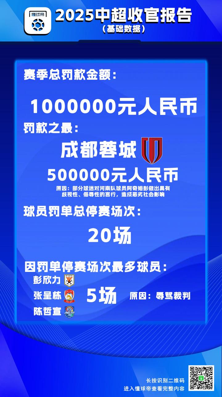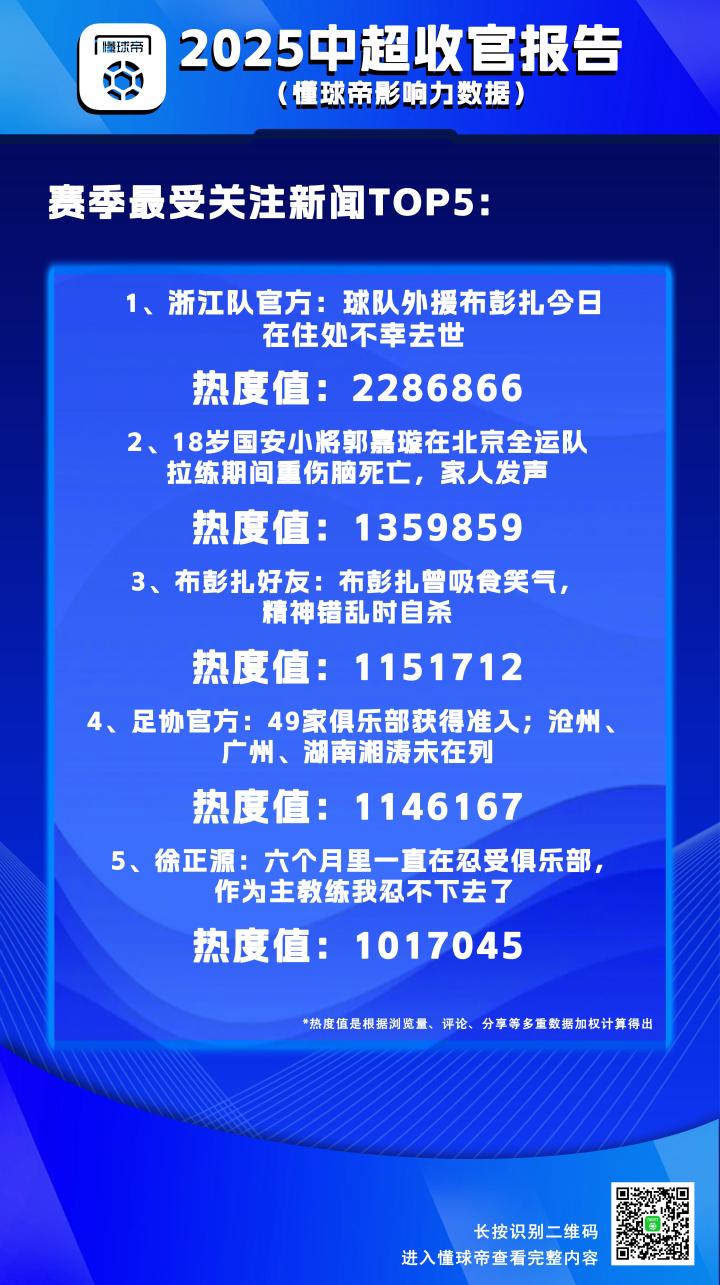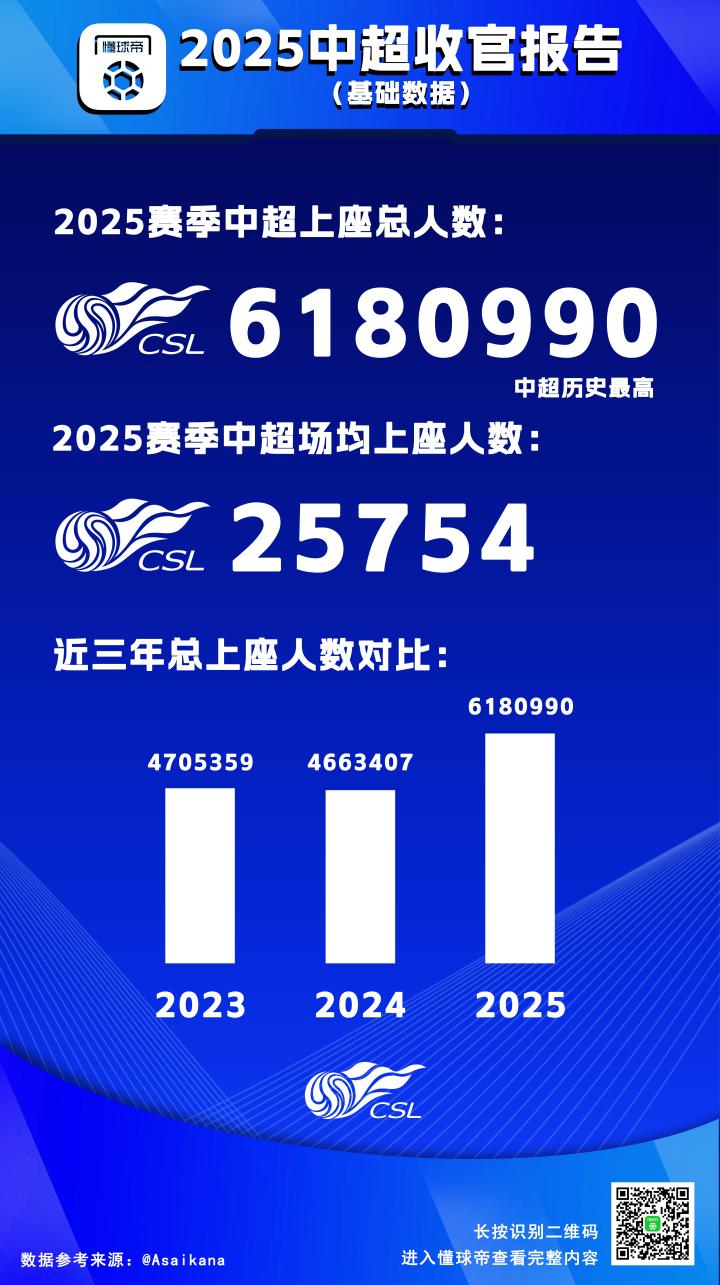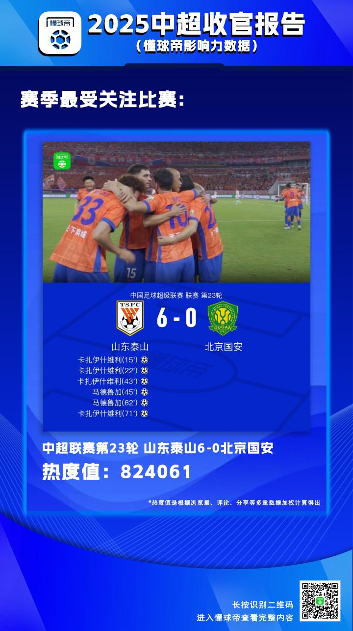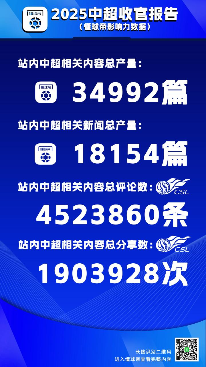 2025赛季中超联赛已经落下帷幕,一年一度的《懂球帝中超收官报告》正式跟大家见面啦。今年,我们将从懂球帝影响力数据、赛事基础数据以及中超MVP相关数据三个方面,来为您呈现这一整个赛季中超的盛况。