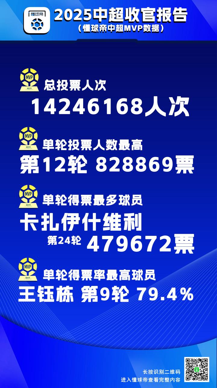 本赛季30轮的懂球帝中超MVP评选中,共收到了约1425万人次的有效投票,这一数据相比于去年的1178万人次提升了近21%。
