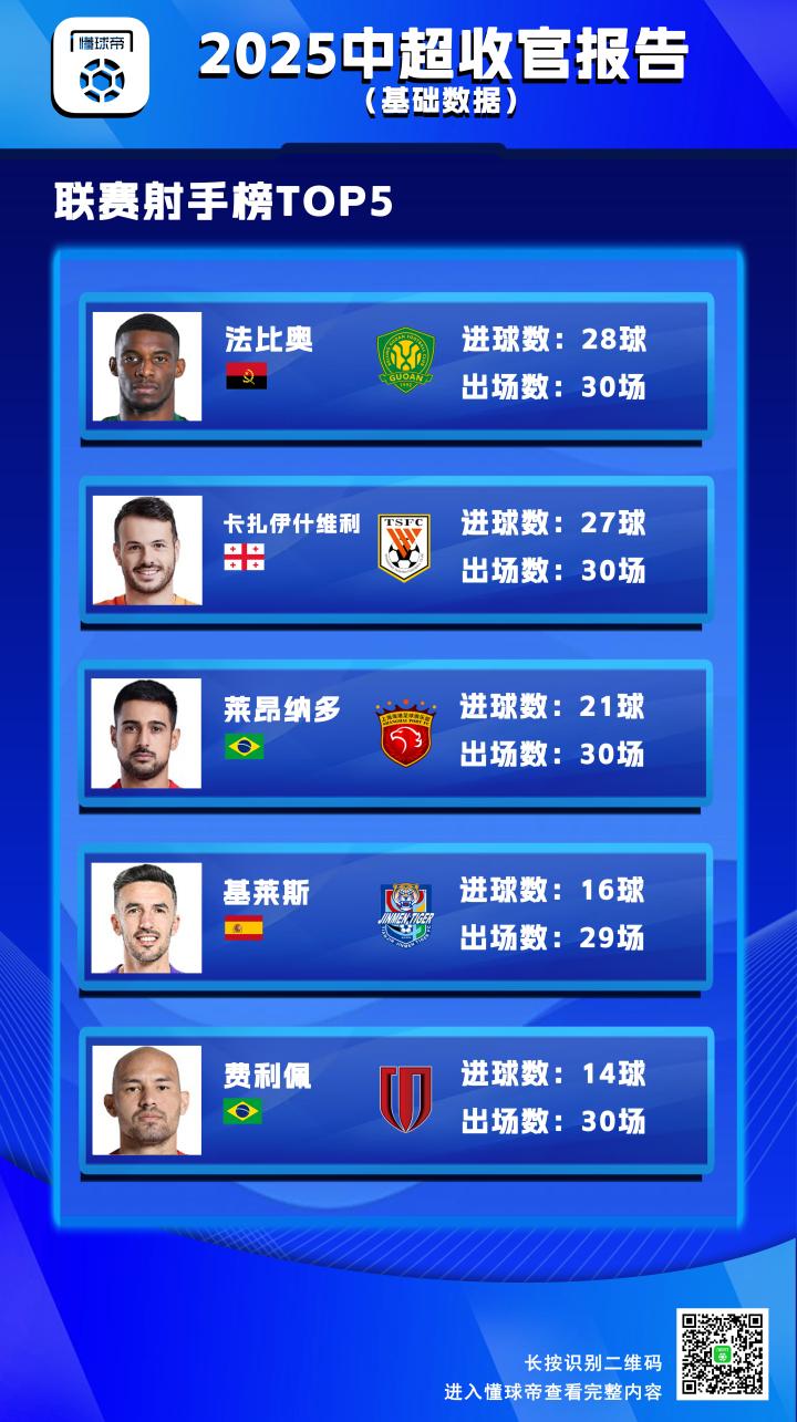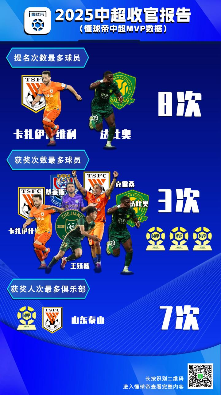 此外,除了瓦科和法比奥之外,还有基莱斯、王钰栋以及克雷桑本赛季都拿到了3座懂球帝中超MVP奖杯,这5位球员也包揽了本赛季一半的懂球帝中超MVP的奖项。