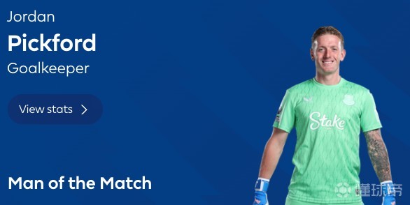 本场比赛埃弗顿门将皮克福德完成了6次扑救,力保球门不失。