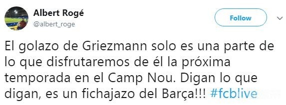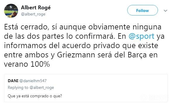 每日体育报记者罗格(Albert Rogé)在推特上称,格列兹曼在今年夏天会100%加盟巴萨。