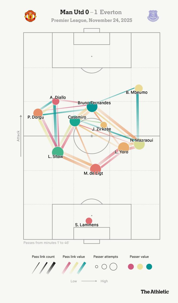 但是,当埃弗顿无缝应对了人数劣势,彼此理解各自角色时,曼联却看起来像是从未一起踢过球。进攻支离破碎,传球频频失误,最尴尬的一幕是卡塞米罗将球踢到了布鲁诺-费尔南德斯身后五码处直接出了边线。
