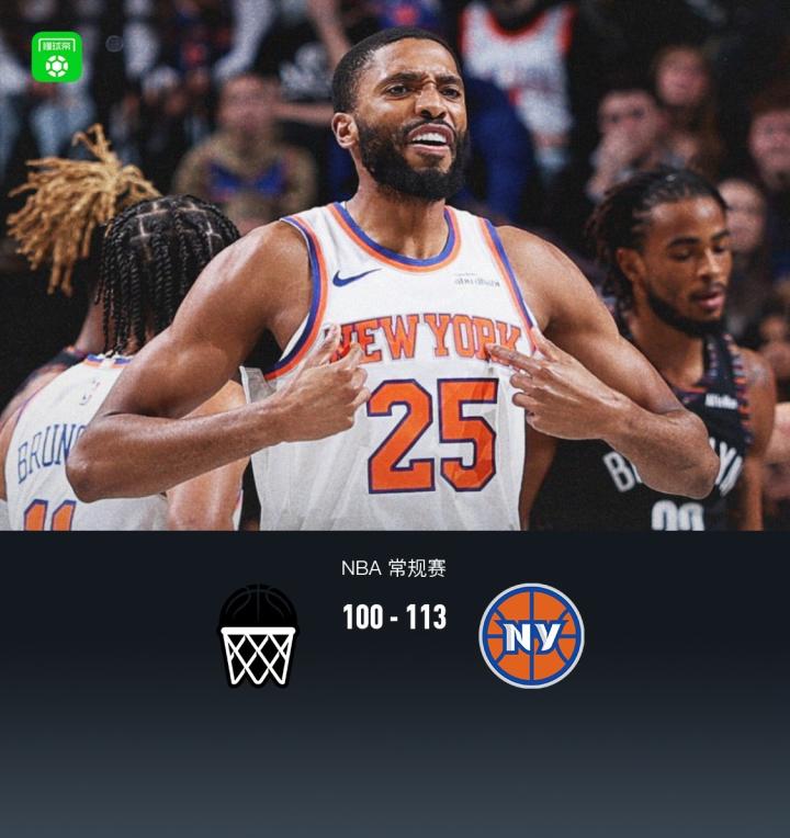 纽约尼克斯唐斯37分12板3助1断2帽,布伦森27分3板3助1断,米卡尔-布里奇斯16分4板4助2断1帽。