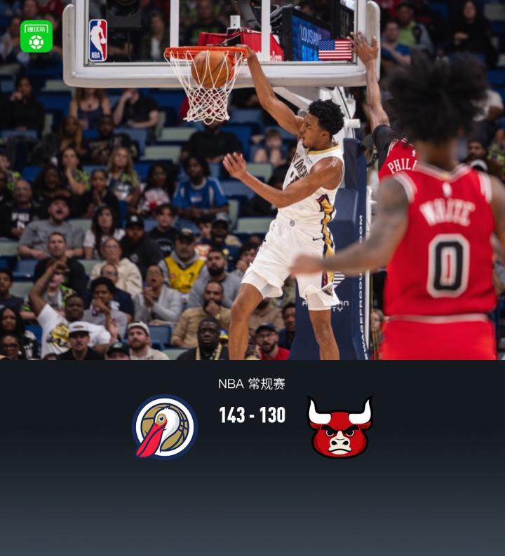 北京时间11月25日NBA 常规赛,新奥尔良鹈鹕对阵芝加哥公牛。半场鹈鹕74-58公牛,最终鹈鹕143-130公牛。新奥尔良鹈鹕锡安-威廉森29分1板2助,萨迪克-贝20分14板3助;芝加哥公牛多森姆28分2板1助,科比-怀特24分5板6助。