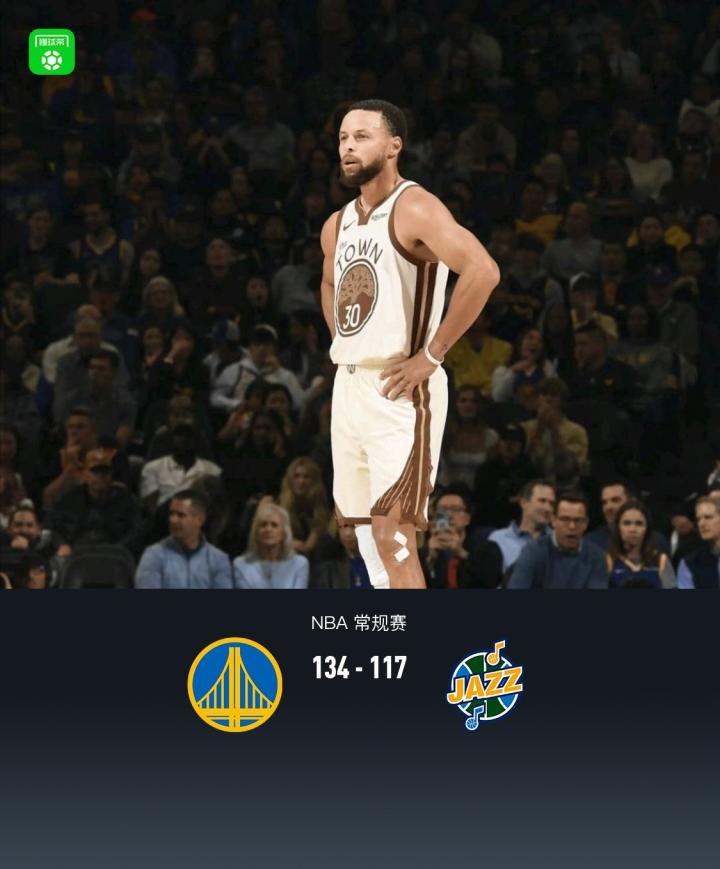 勇士134-117爵士结束3连败,库里31分,李凯尔12+7+5