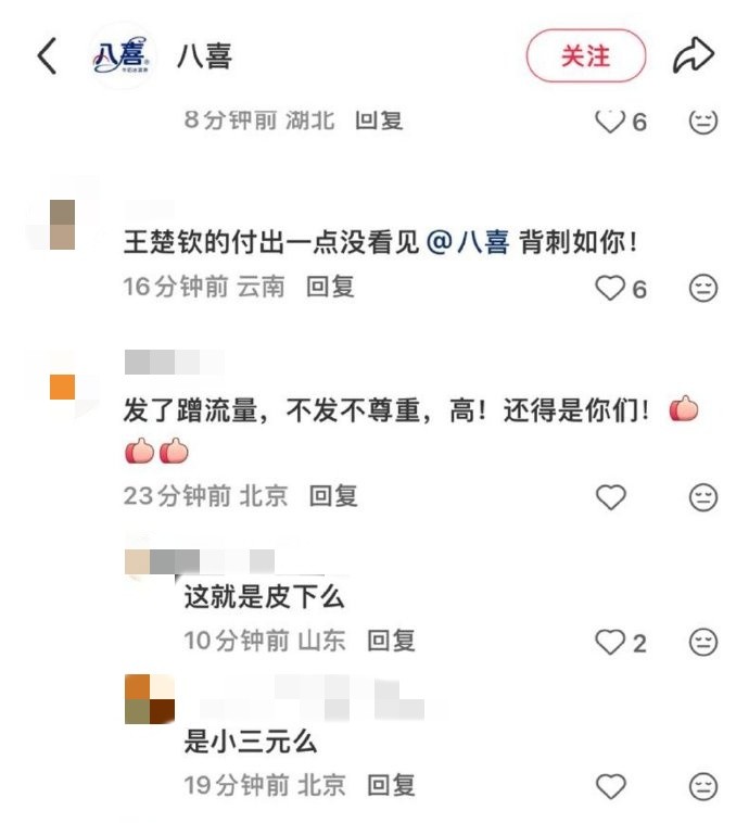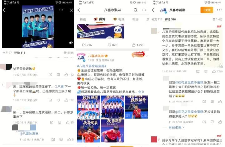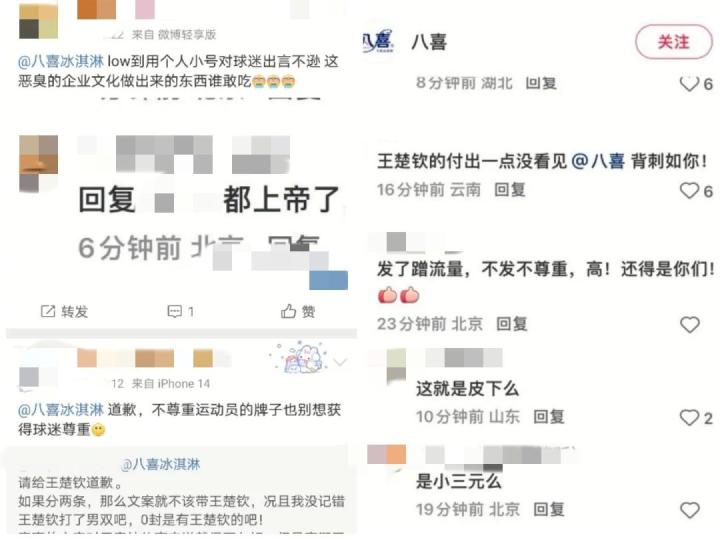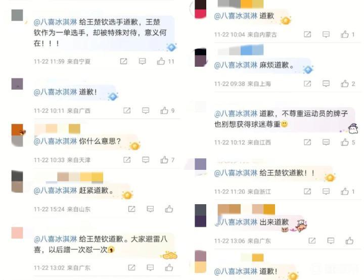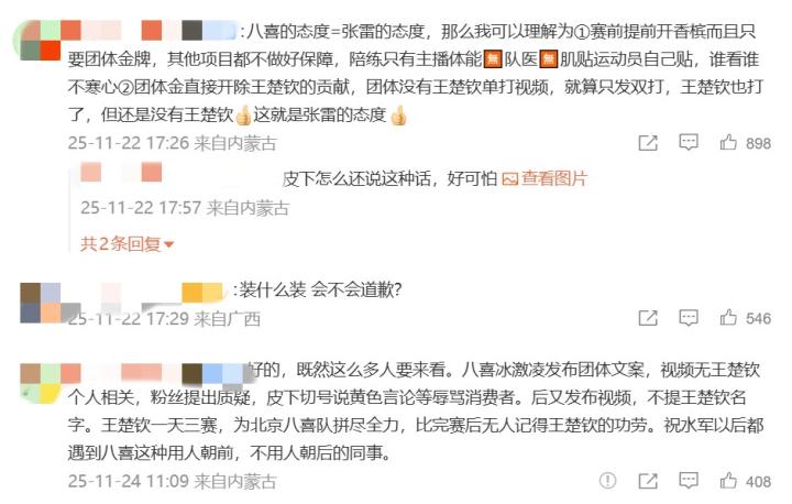 有粉丝写道:“八喜的态度就代表北京队的态度,所以北京队的态度就代表张雷的态度。所以谁支持这个八喜谁就是王楚钦黑粉。”
